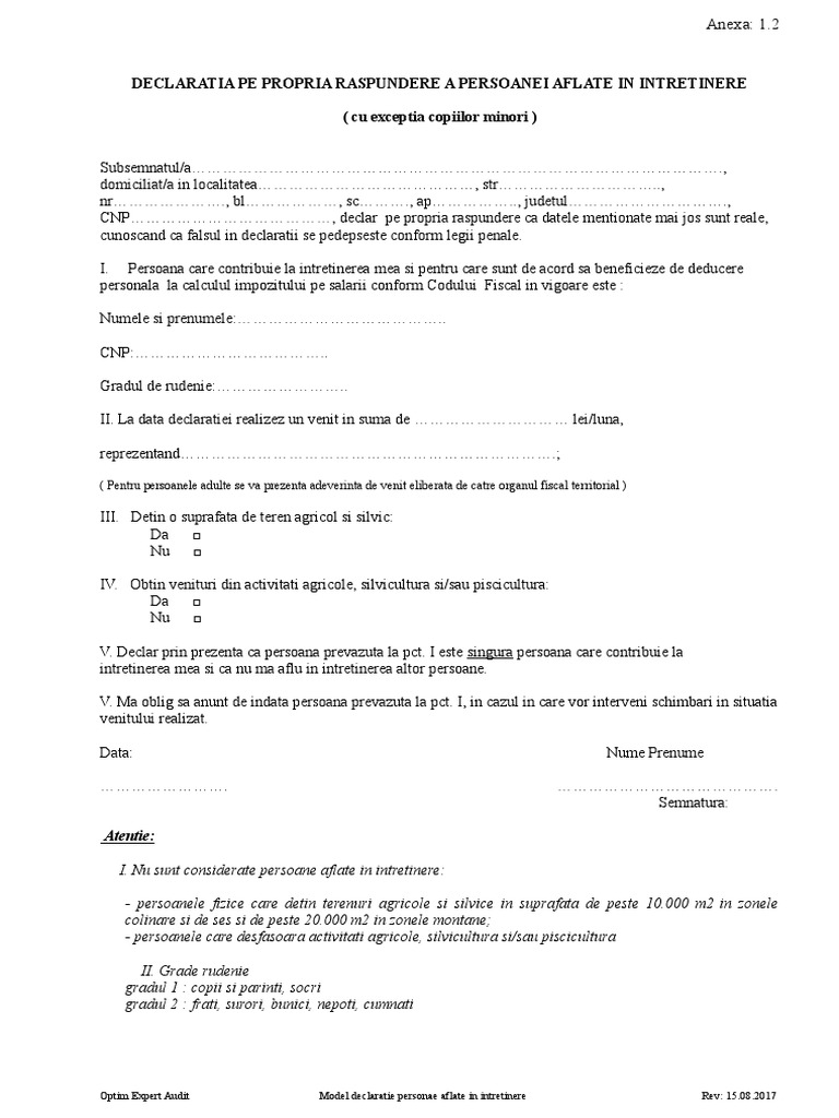 Declaratie Pr Persoane In Intretinere Model 1