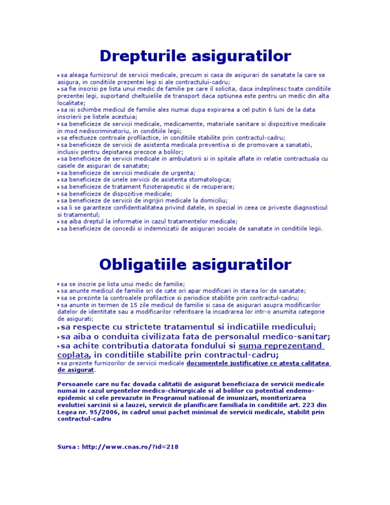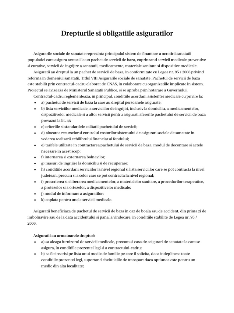 Drepturile si obligatiile asiguratilor. Obligatiile asiguratilor pentru a putea beneficia de aceste drepturi sunt urmatoarele. Să aleagă furnizorul de servicii medicale precum şi casa de asigurări de sănătate la care se asigură să fie înscrişi pe lista unui medic de familie pe care îl solicită. Drepturile pacientului legea drepturilor pacientului. Drepturile si obligatiile asiguratilor in conformitate cu prevederile legii 95 2006 privind reforma in domeniul sanatatii drepturile asiguratilor.