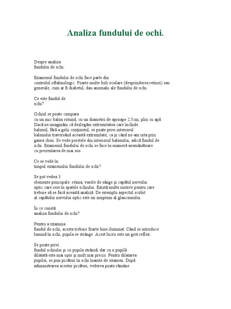 Indicatii examenul fundului de ochi practicat sistematic cu prilejul oricarui examen oftalmologic complet este indicat pentru a stabili diagnosticul afectiunilor retinei si pe cele ale coroidei membrana lipita de retina cu rol in nutritia acesteia el da posibilitatea de asemenea sa se observe vascularizatia retiniana care poate fi modificata de numeroase boli. O tumoare cerebrala modifica fundul de ochi vasele in interiorul globului ocular arata altfel cand o formatiune canceroasa perturba tot creierul. Indicatii examenul fundului de ochi practicat sistematic cu prilejul oricarui examen oftalmologic complet este indicat pentru a stabili diagnosticul afectiunilor retinei si pe cele ale coroidei membrana lipita de retina. Indicatii examenul fundului de ochi practicat sistematic cu prilejul oricarui examen oftalmologic complet este indicat pentru a stabili diagnosticul afectiunilor retinei si pe cele ale coroidei membrana lipita de retina cu rol in nutritia acesteia el da posibilitatea de asemenea sa se observe vascularizatia retiniana care poate fi modificata de numeroase boli.