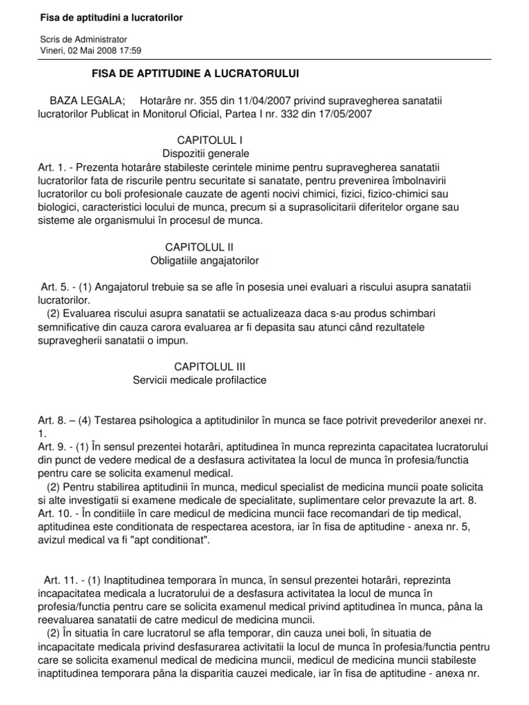 Apt pentru muncă în cazul în care persoana este sănătoasă și capabilă de muncă. Fisa de aptitudine nu fisa de aptitudini prezentata e veche si inlocuita prin hg 1169 2011. Se vor realiza in mod obligatoriu pentru toti lucratorii la un interval ce nu poate fi mai mare de 1 an in functie de istoricul lucratorului si de fisa de identificare a factorilor de risc profesional. 8 cu concluzia examenului medical la angajare.