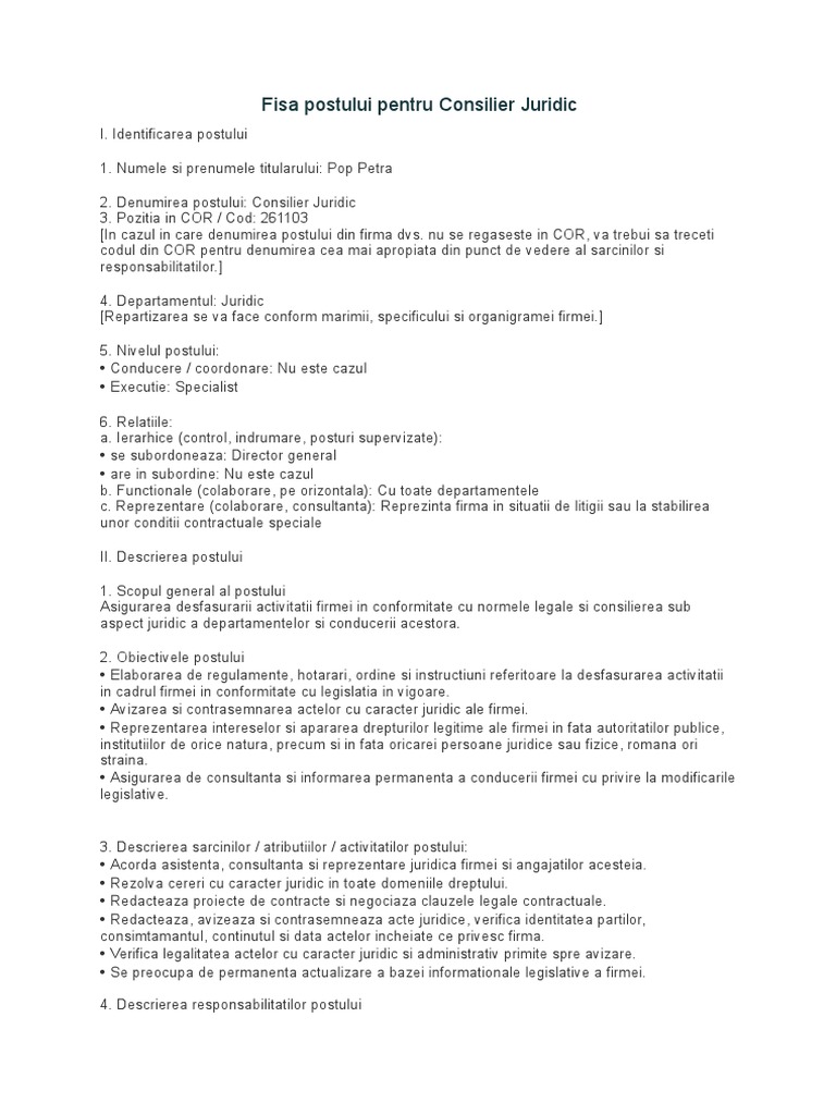 Fisa Postului Pentru Consilier Juridic