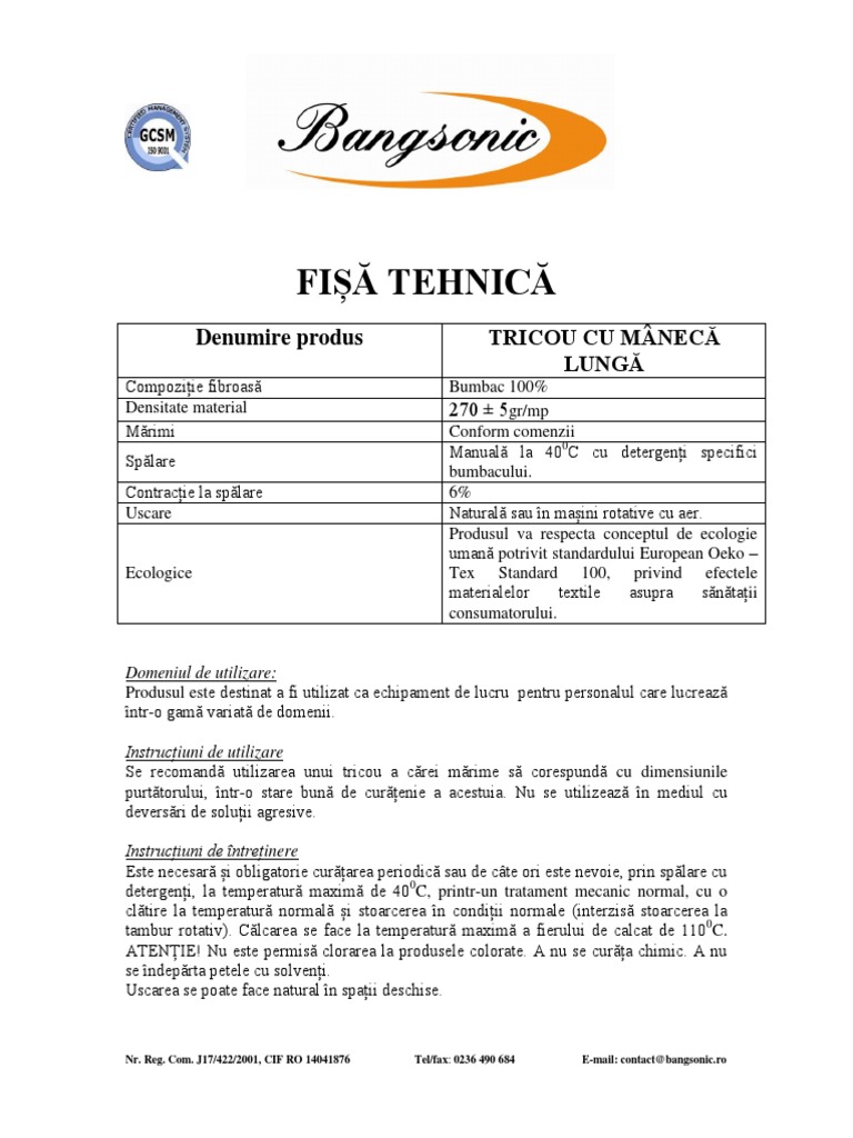 Fisa Tehnica Tricou Maneca Lunga