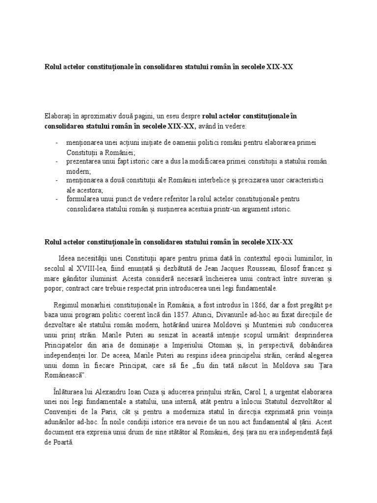 Formarea statului roman modern si evolutia acestuia in sec 19. B unele reforme din secolele xviii xx au contribuit la formarea statului român modern. B precizarea unei act politice care a contribuit la realizarea statului roman modern. Dupa realizarea unirii din 1859 principalul obiectiv al romniei n relaiile internaionale s a orientat spre obinerea independenei fa de imperiul otoman precum i a unor garanii de securitate care s o fereasc de posibile agresiuni externe. Formarea statului roman modern si evolutia acestuia subiectul al iii lea 30 de puncte elaboraţi în aproximativ două pagini un eseu despre evoluția statului român modern având în vedere precizarea unui factor intern sau extern care a contribuit la întemei.