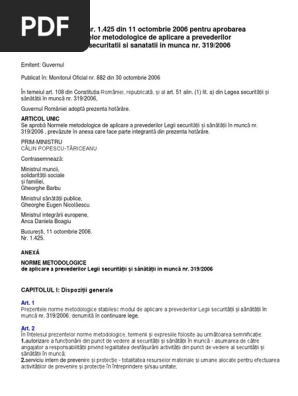 Hotărarea Nr 1425 2006 Pentru Aprobarea Normelor Metodologice De Aplicare A Prevederilor Legii Securității și Sănătății In Muncă Nr 319 2006 Lege5 Ro