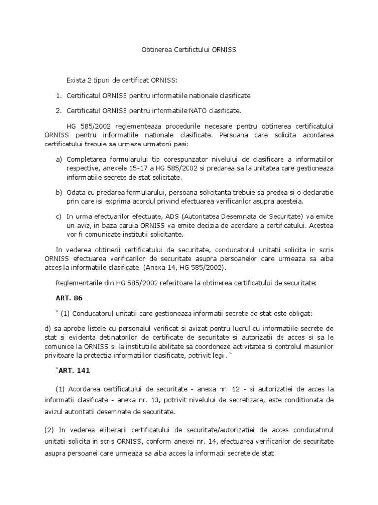 585 din 13 iunie 2002 pentru aprobarea standardelor naţionale de protecţie a informaţiilor clasificate în românia. 248 din 12 aprilie 2002 parlamentul româniei adopta prezenta lege. Informațiile clasificate vor fi marcate inscripționate și gestionate numai de către persoane care au autorizație sau certificat de securitate corespunzător nivelului de clasificare a acestora. Legislaţia naţională şi ordinele directorului orniss cu privire la informaţiile clasificate legea 182 2002 privind protecţia informaţiilor clasificate.