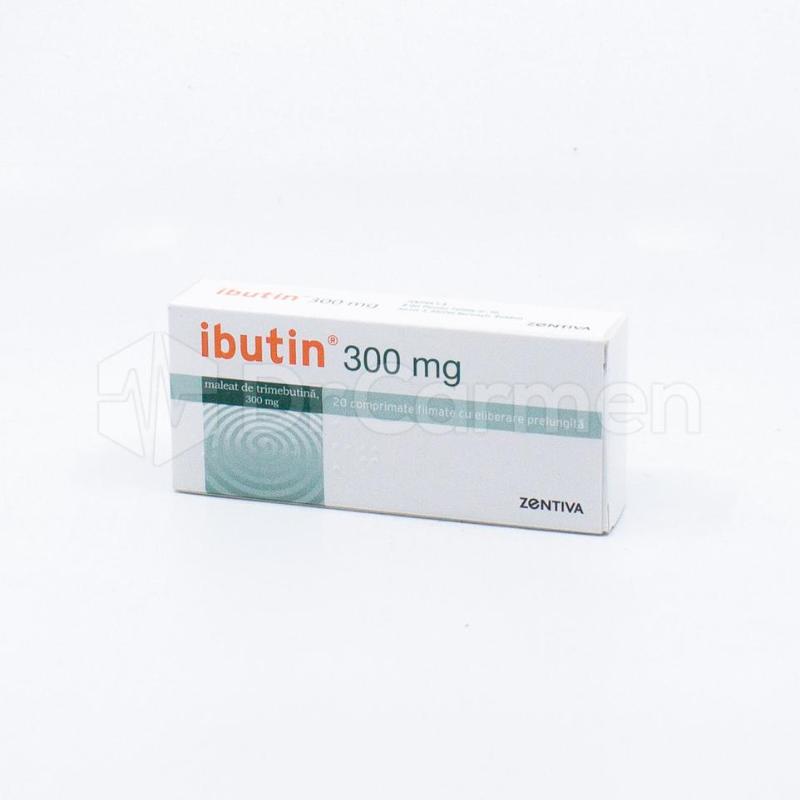Ibutin 300 mg pret. La inceputul tratamentului se pot administra 600 mg maleat de trimebutină 2 comprimate filmate cu eliberare prelungita ibutin pe zi în două prize dimineata si seara timp de 6 zile urmat de tratament de intretinere cu 300 mg maleat de trimebutină un comprimat filmat cu eliberare prelungită ibutin pe zi timp de 20 de zile. Tratamentul simptomatic al durerilor tulburarilor de tranzit si disconfortului abdominal legate de tulburarile functionale ale tubului digestiv. Hidroxipropilmetilceluloza dioxid de titan. Ibutin 300 mg este un medicament produs de galenica sa si distribuit de zentiva sa.