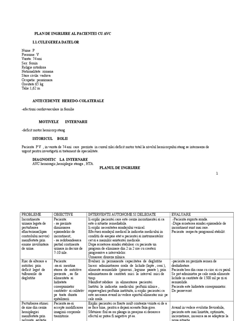 Ingrijirea pacientului cu avc plan de ingrijire. Plan de nursing exemplu diagnostic de nursing. Nevoia diagnostic obiective de nursing pacientul sa aiba o respiratie si o circulatie normala prin ameliorarea schimburilor gazoase si mentinerea unei ta in limite normale interventii proprii si delegate pozitionarea adecvata a pacientului semi sezand sau decubit dorsal camera bine aerisita si confort termic 20 22 grade c umezesc aerul din incapere. Dat fiind rata destul de crescuta a morbiditatii si mortalitatii prin accidente vasculare cerebrale in special la persoanele peste 65 de ani o atentie deosebita trebuie acordata prevenirii si tratarii acestor afectiuni atunci cand acestea s au produs. Iti recomandam sa te uiti bine pe extras si pe imaginile oferite iar daca este ceea ce ti trebuie pentru documentarea ta il poti descarca.