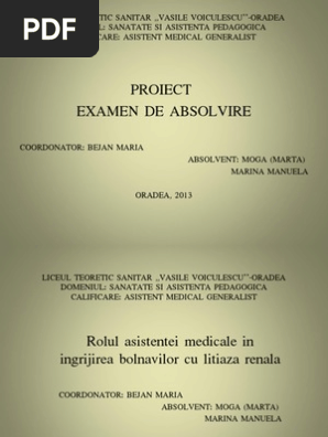 Da prezentare power point. Am ales ca tema ingrijirea pacientului cu litiaza renala datorita faptului ca in activitatea practica pe care am desfasurat o in timpul stagiului clinic in cei trei ani am acordat ingrijiri de nursing mai multor pacienti care. Lucrare de licenta amg. Ngrijirea pacientului cu litiaz renal.