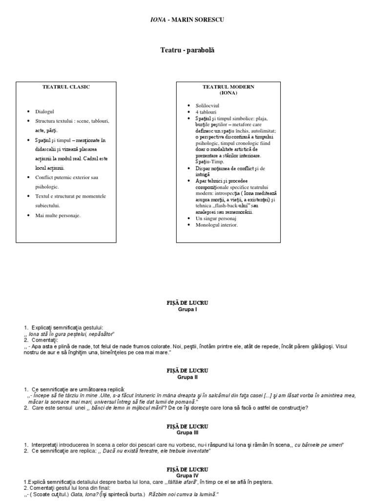 Acest text dramatic nu poate fi încadrat cu certitudine într o singură specie literară cu toate că sorescu şi a autointitulat piesa tragedie în patru tablouri. De eugen ionescu comentariu literar rezumat literar ca manifestare. Iona nu își realizează situația fiind preocupat de prinderea peștelui cel mare. Iona este pescar este omul aflat în faţa întinderii imense de apă marea.